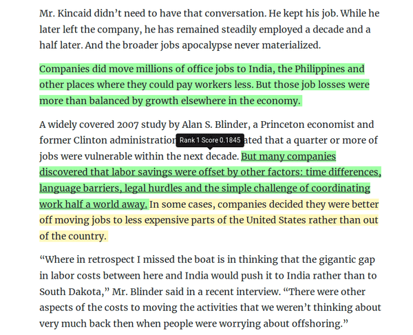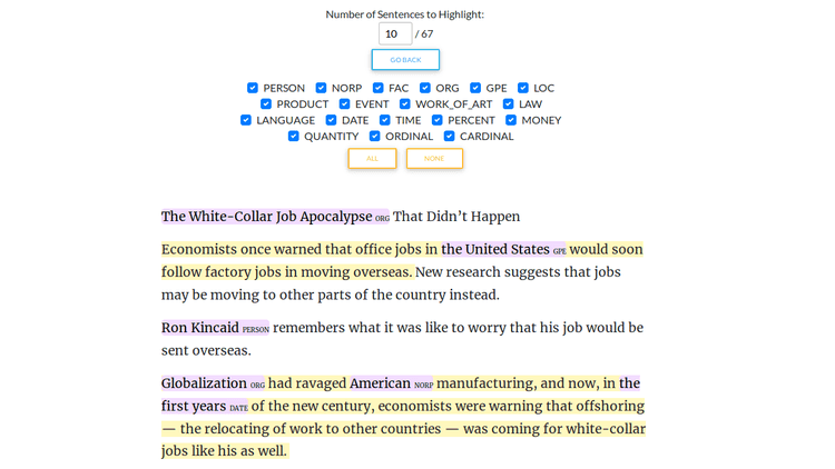 This A.I.-powered article reader can extract the text contents from web pages, partition the article into sentences, identify named entities in each sentence, and highlight the sentences that convey the article's core ideas (in yellow).