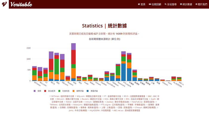 Veritable News is a news aggregation site of articles in Chinese from both international and local news outlets. To reduce the amplification of bias in algorithms, we provide a daily human-curated list of essential news, categorized into five different sections: headlines, politics and economics, society and technology, other international news and analyses, and local news and analyses in Taiwan and Hong Kong.